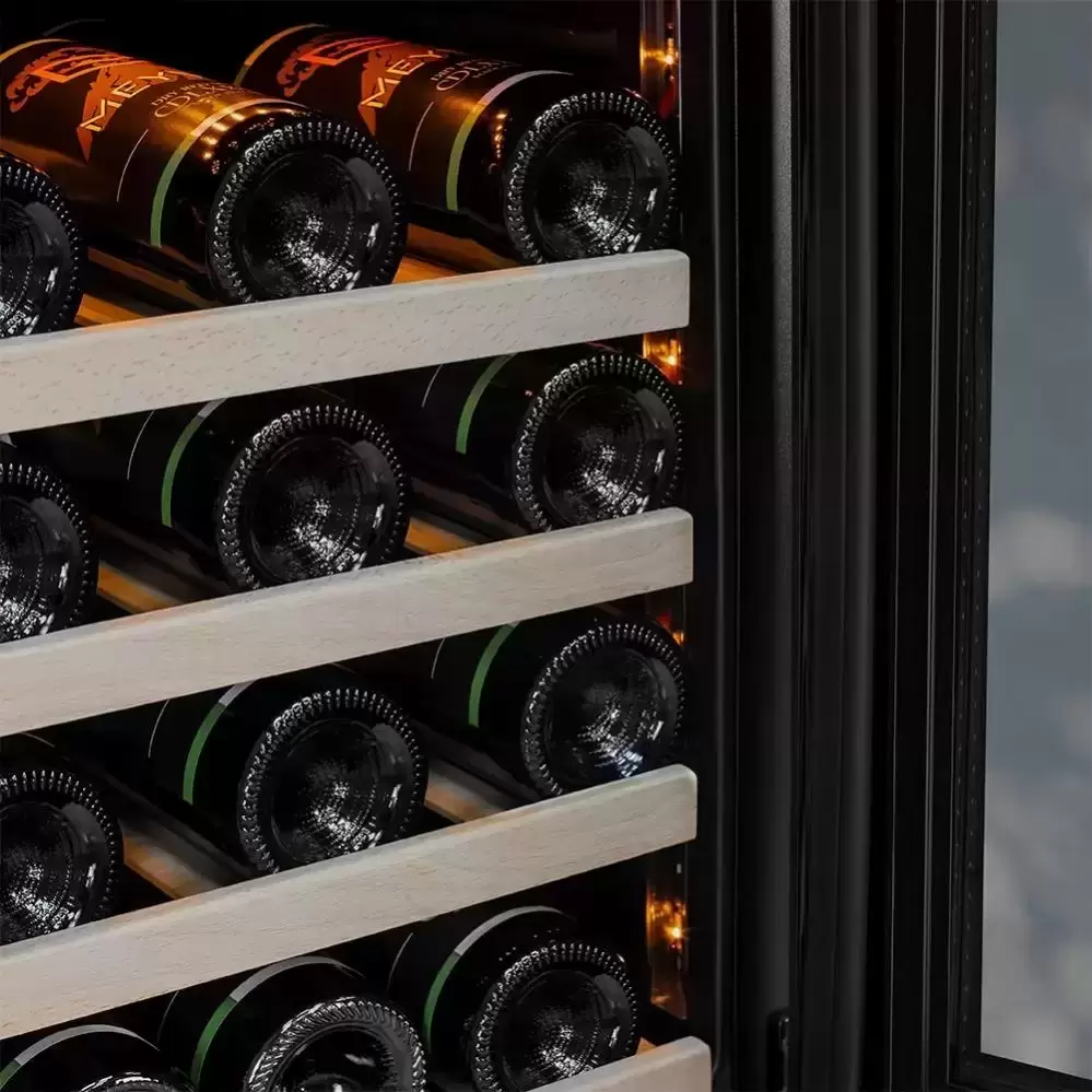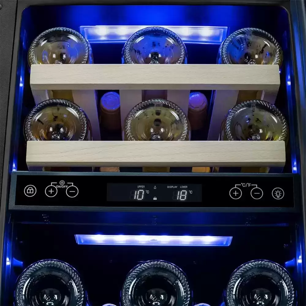 Двухтемпературный винный шкаф, Блокировка для защиты от детей, Дверь со стеклопакетом, Материал полок дерево, Фильтр из активированного угля, Индикация повышения температуры, Внутреннее освещение